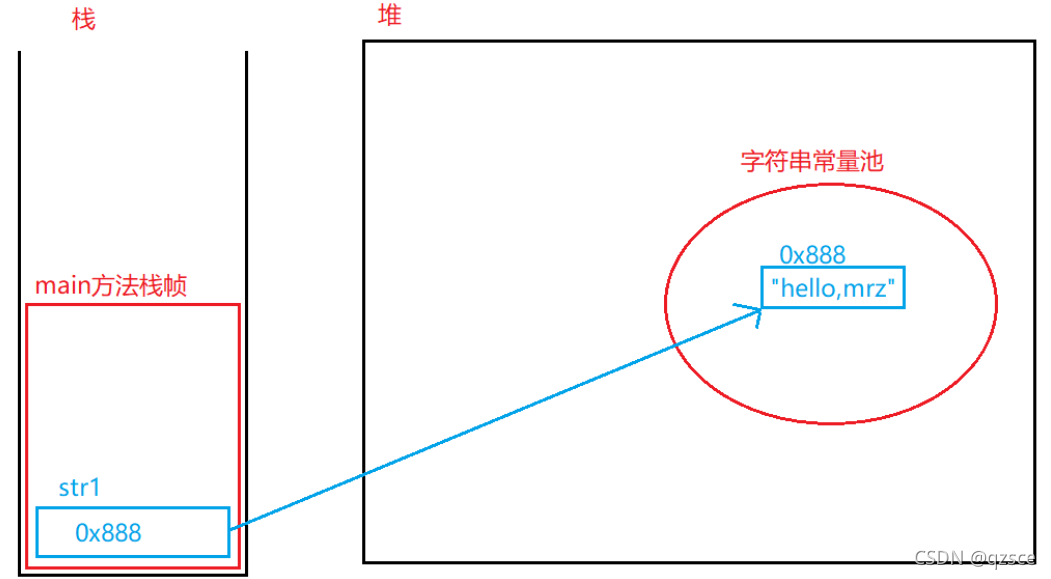 因为池中没有"hello,mrz",所以会在池中创建一个"hello,mrz"对象,返回引用给str2
