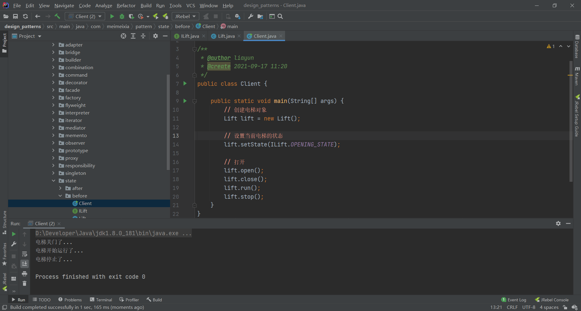然后,我们再来看一下ILift接口的子实现类,即Lift。可以看到,在该类里面定义了一个state属性,这个属性就是用来记录当前电梯状态的。除此之外,该类还重写了父接口中的所有抽象方法。