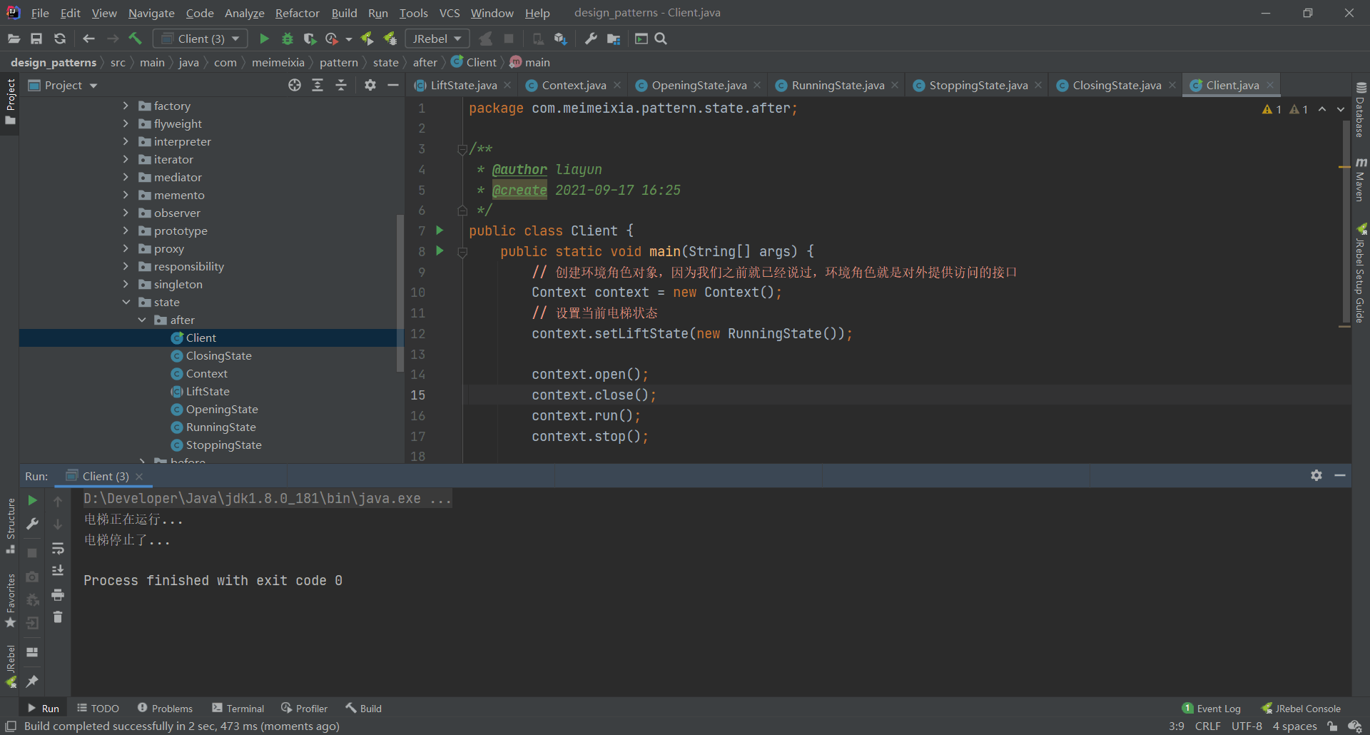 最后,我们来看一下Context类,它充当的是状态模式里面的环境角色。在该类里面,我们定义了四个具体状态类对象的常量,除此之外,我们还定义了一个LiftState类型的成员变量,它是用来记录当前电梯状态的,并且为它我们也提供了对应的getter和setter方法。