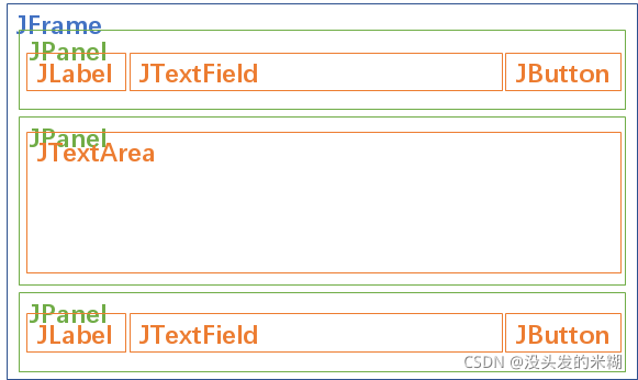 我们将界面分为上、中、下三个部分,分别使用三个JPanel包裹(为了方便布局,建议将组件放置于JPanel而非直接置于顶层容器JFrame中。),在ServerWindow类中也加入这些组件。