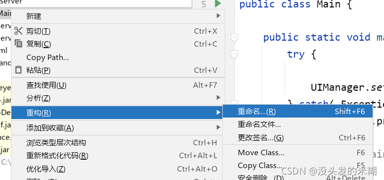 这里建议使用IDEA的代码重构功能,在需要修改的类名、变量名上右键,使用重构 - 重命名,即可将整个代码中所有出现的该标识符自动替换为新名字。