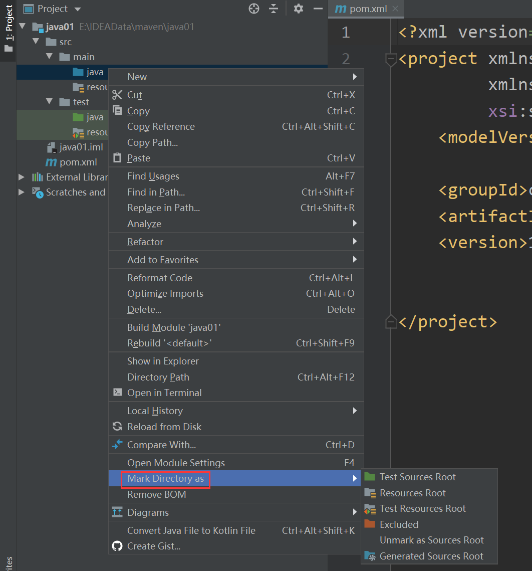 至此,一个Maven工程便创建好了。除此之外,若想改变文件夹的资源类型,也可以右键点击,选择Mark Directory as进行修改(一般保持Maven的默认即可)。  在pom.xml中引入需要的依赖,此处以Junit的jar为例(初次引入时需要联网下载,若代码报错,可以点击右侧的Maven按键,在里面选择刷新),那么这样Junit的jar包就导入到项目里了。