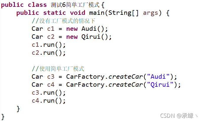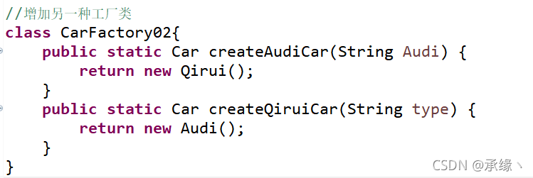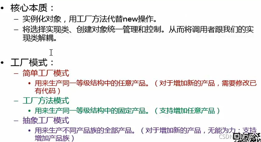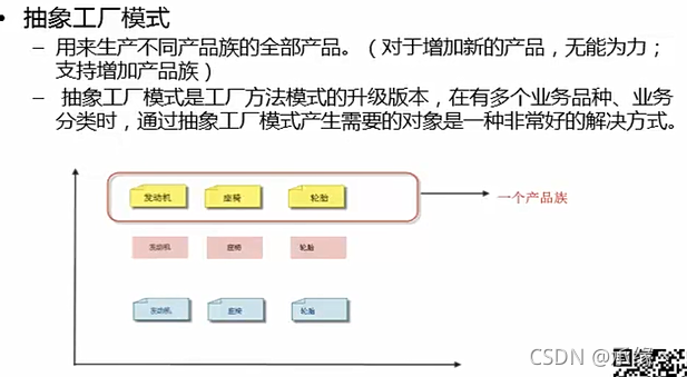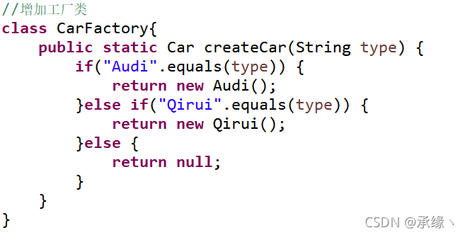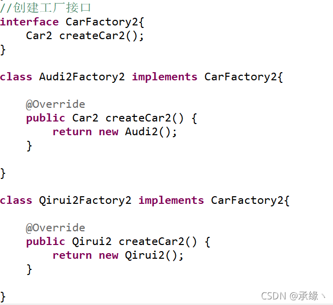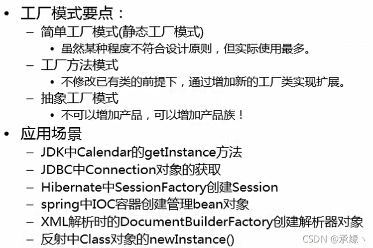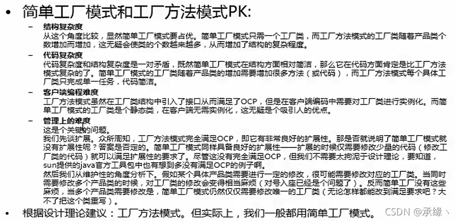 它与简单工厂模式最大的不同在于简单工厂模式只有一个工厂类,而工厂方法模式有一组实现了相同接口的工厂类。它符合开闭原则,当需要扩展的时候,不用修改已有代码,只需要增加。