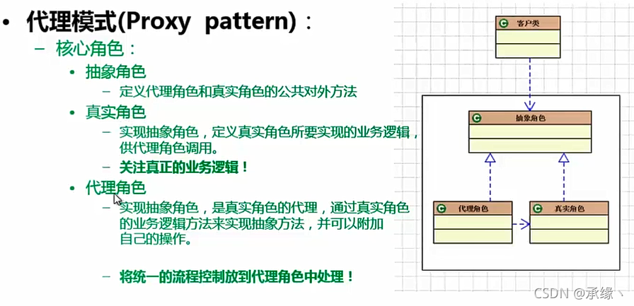 通过代理,控制对对象的访问。可以详细控制访问某个类或对象的方法,在调用这个方法前做前置处理,调用这个方法后做后置处理,即AOP(Aspect Oriented Programming面向切面编程)的微观实现,从而实现将统一流程代码放到代理类中处理。