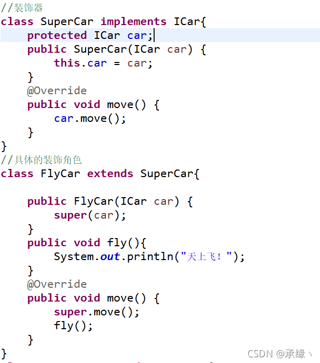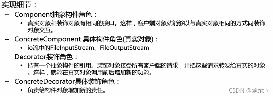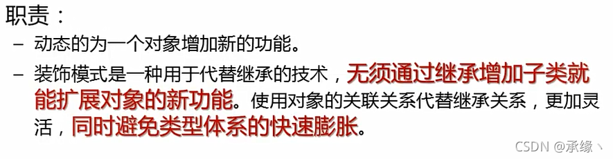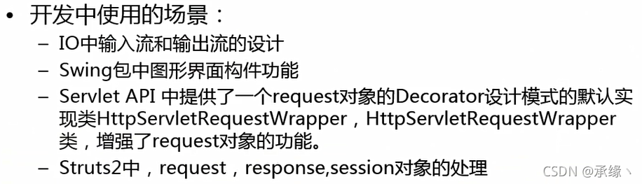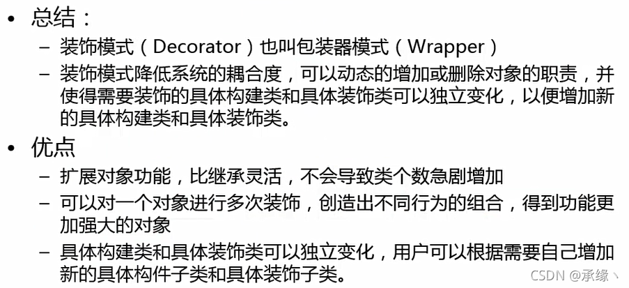 缺点是会产生很多的小对象,大量小对象占据内存,一定程度上影响性能,且装饰模式易出错,调试排查比较麻烦。