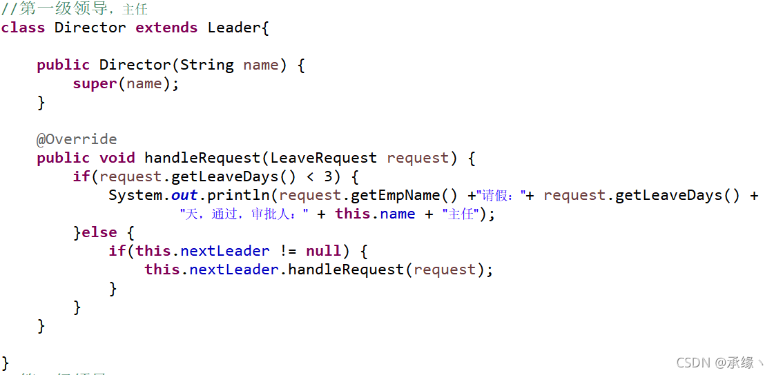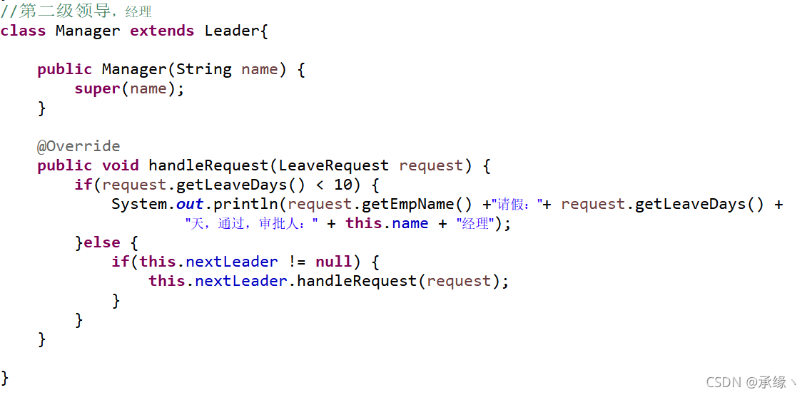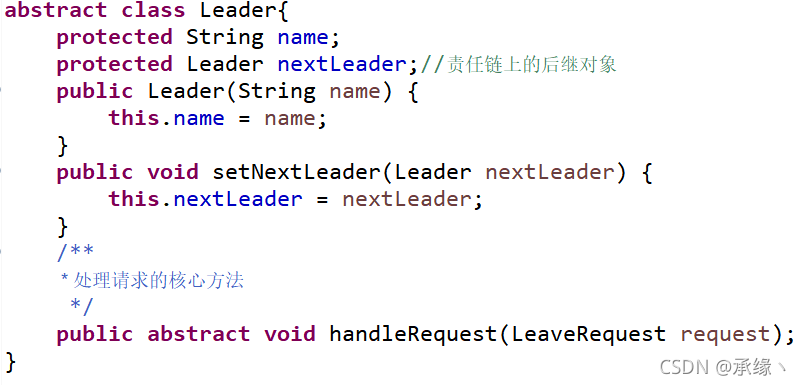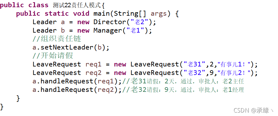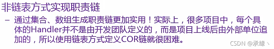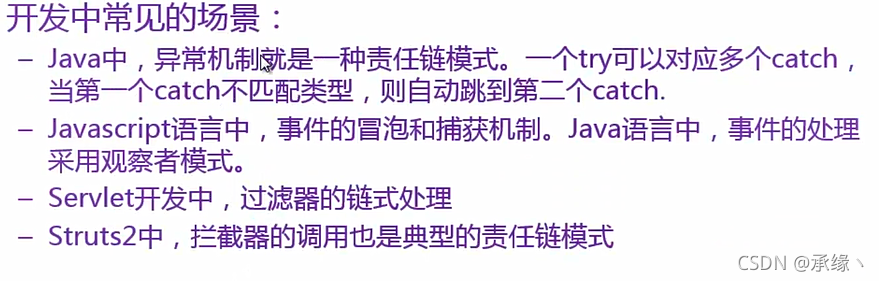 将能够处理同哟类请求的对象连成一条链,所提交的请求沿着链传递,链上的对象逐个判断是否有能力处理该请求,如果能就处理,否则就传递给链的下一个。