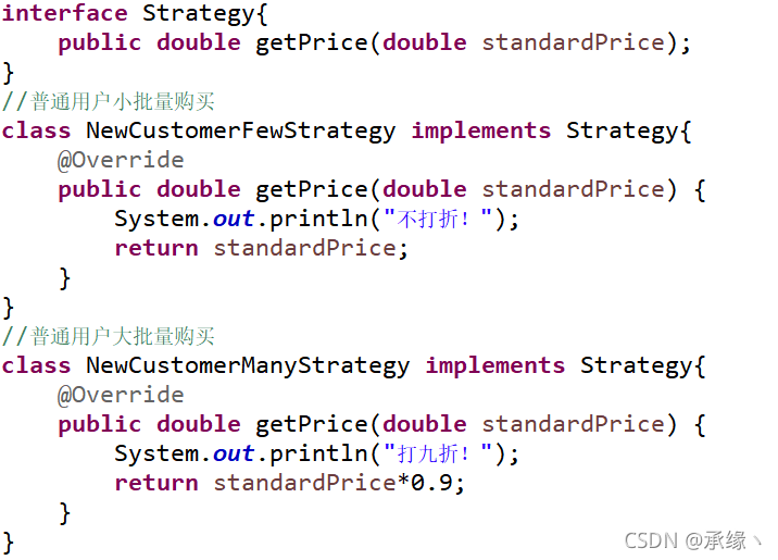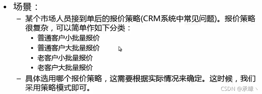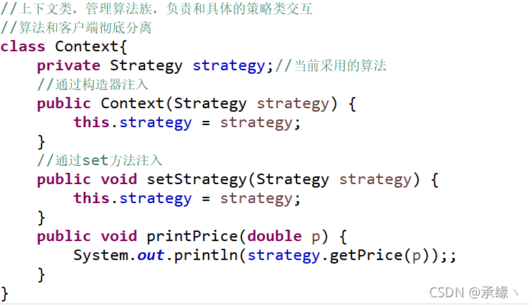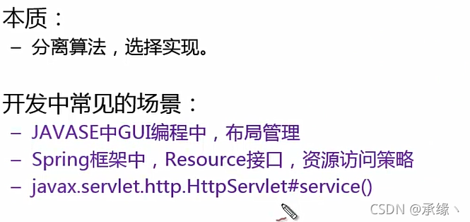 对应于解决某一个问题的一个算法族,允许用户从该算法族中任选一个算法解决某一问题,同事可以方便地更换算法或者新增算法,并且由客户端决定调用哪个算法。