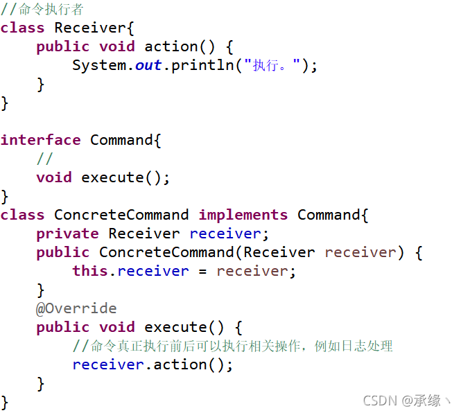将一个请求封装为一个对象,从而使我们可用不同的请求对客户进行参数化,对请求排队或者记录请求日志,以及支持可撤销的操作,也称为“动作Action模式”,“事务transatcion模式”。
