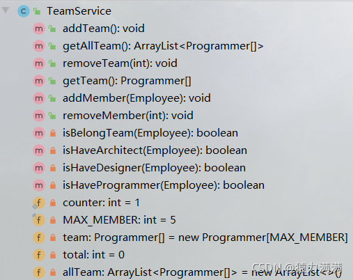 ???????最后是私有的仅供本类addMember方法调用的4个团队成员判断方法,作用是为了判断团队成员的组成情况,以便抛出异常。isBelongTeam方法是判断待添加成员对象是否在当前团队中;isHaveArchitect方法是当待添加成员对象是架构师时,判断当前团队中是否已经有一名架构师;isHaveDesigner方法是当待添加成员对象是设计师时,判断当前团队中是否已经有两名设计师;isHaveProgrammer方法是当待添加成员对象是程序员时,判断当前团队中是否已经有三名程序员。