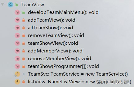 ???????然后是teamShowView、addMemberView和removeMemberView方法,这三个方法分别实现查看团队成员列表、添加团队成员和删除团队成员这三个子功能的交互界面(这三个方法都是private,仅供本类addTeamView方法调用)。最后是teamShow方法,本方法是打印当前团队成员列表(这个方法也是private,仅供本类teamShowView、removeMemberView方法调用)。