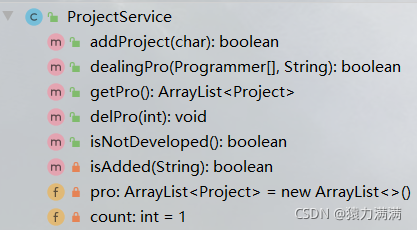 ? ? ? ?ProjectService类包含6个方法。前4个是主要方法,addProject方法是实现项目的添加功能,dealingPro方法是实现项目分配开发团队功能,getPro方法是实现项目的查看功能,delPro方法是实现项目的删除功能。后2个是辅助方法,?isNotDeveloped方法是判断是否有未被开发的项目,isAdded方法是判断项目是否已被添加到集合中(此方法是private,仅供本类addProject方法调用)。