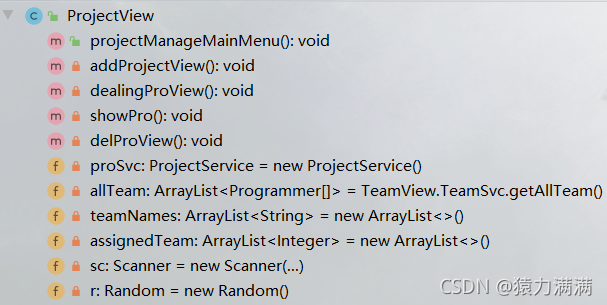 ???????ProjectView类包含5个方法。首先是projectManageMainMenu方法,该方法是实现开发项目管理主菜单。然后是addProjectView、dealingProView、showPro和delProView方法,这四个方法分别实现项目的添加功能交互界面、项目分配开发团队交互界面、项目的查看展示和项目的删除交互界面(这四个方法都是private,仅供本类projectManageMainMenu方法调用)。