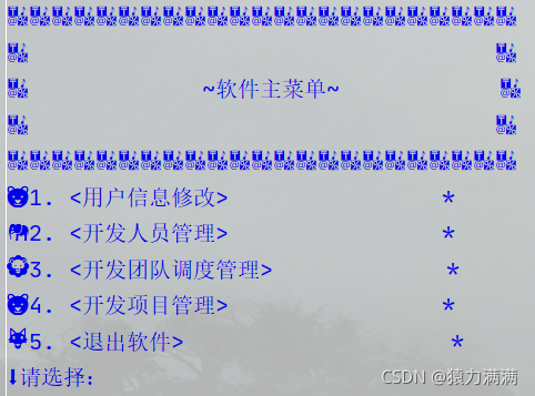 System.out.println("🔣 ~软件主菜单~ 🔣");