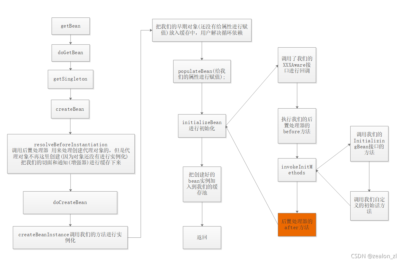 spring中用一句getBean就能取出一个实例化好的bean,这个bean是属于IOC容器管理的,下面是源码大致流程图: