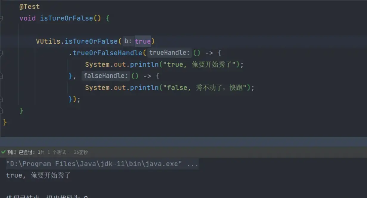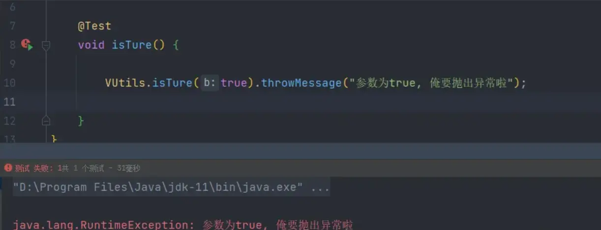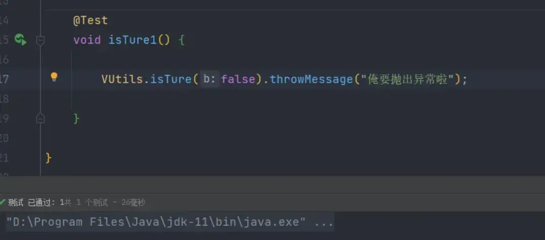 编写判断方法 创建工具类VUtils并创建一个isTure方法,方法的返回值为刚才定义的函数式接口-ThrowExceptionFunction。ThrowExceptionFunction的接口实现逻辑为当参数b为true时抛出异常