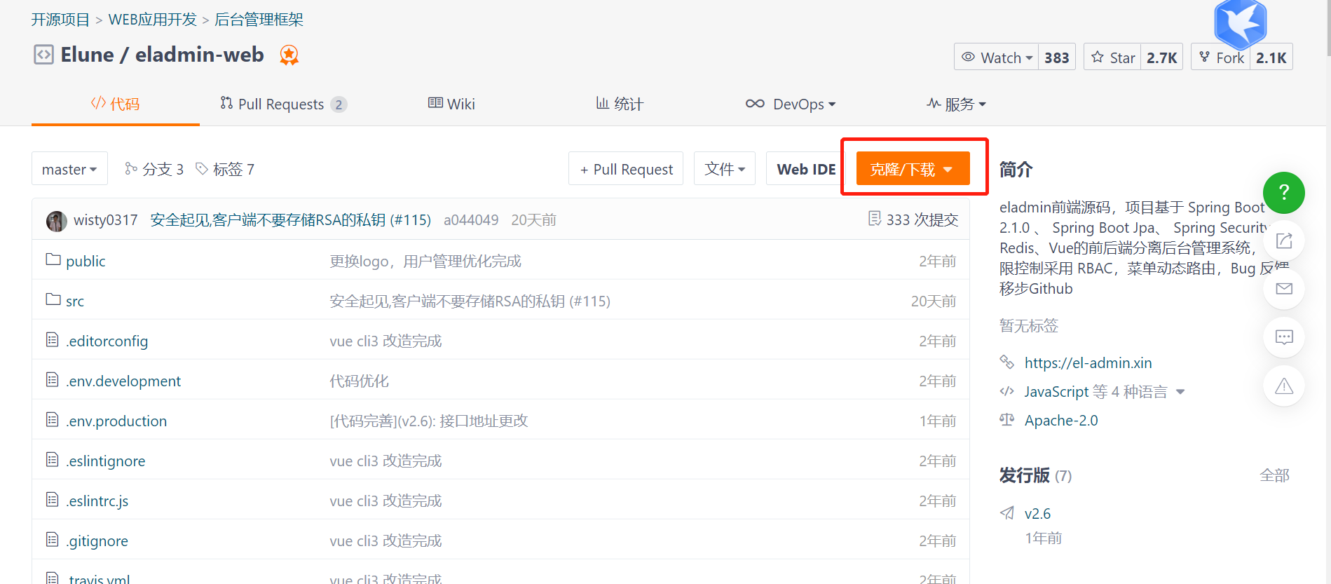 然后分别下载前端工程和后端工程 github下载或拉代码比较慢,可以选码云来下载   如果下载后的压缩包无法打开,那就idea拉代码吧 我是直接拉的代码,因为,下载zip真的很慢 如果不会,请看我的另一篇文章