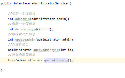 3.写完这个就该写服务层了(也就是service层) service层其实就是调用dao层 首先创建接口 xxxxservice 然后其实我们直接可以将xxxxmapper里的东西粘贴过来就行 这是我粘贴完的东西,其实和xxxxmapper里是一模一样的  然后就是创建xxxxserviceImpl.xml文件