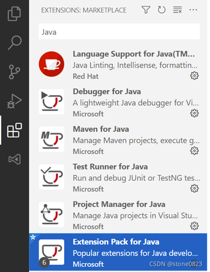 安装的方法:打开 Visual Studio Code,点击左边 Extensions 面板,在查找的文本框中输入 Java,选择需要的 Extension 进行安装。  在这些 Extension 中, Extension Pack for Java 是微软提供的扩展,安装后包括了 6 个必要的扩展,刚才所说的 4 个都在其中。也就是说,为了开发 Java,我们安装这一个扩展就可以了。