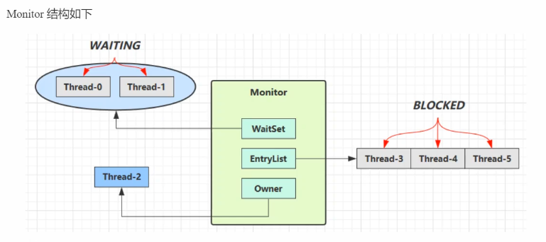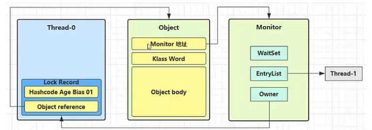 每个 Java 对象都可以关联一个 Monitor 对象,如果使用 synchronized 给对象上锁(重量级)之后,该对象头的 Mark Word 中就被设置指向 Monitor 对象的指针  图解