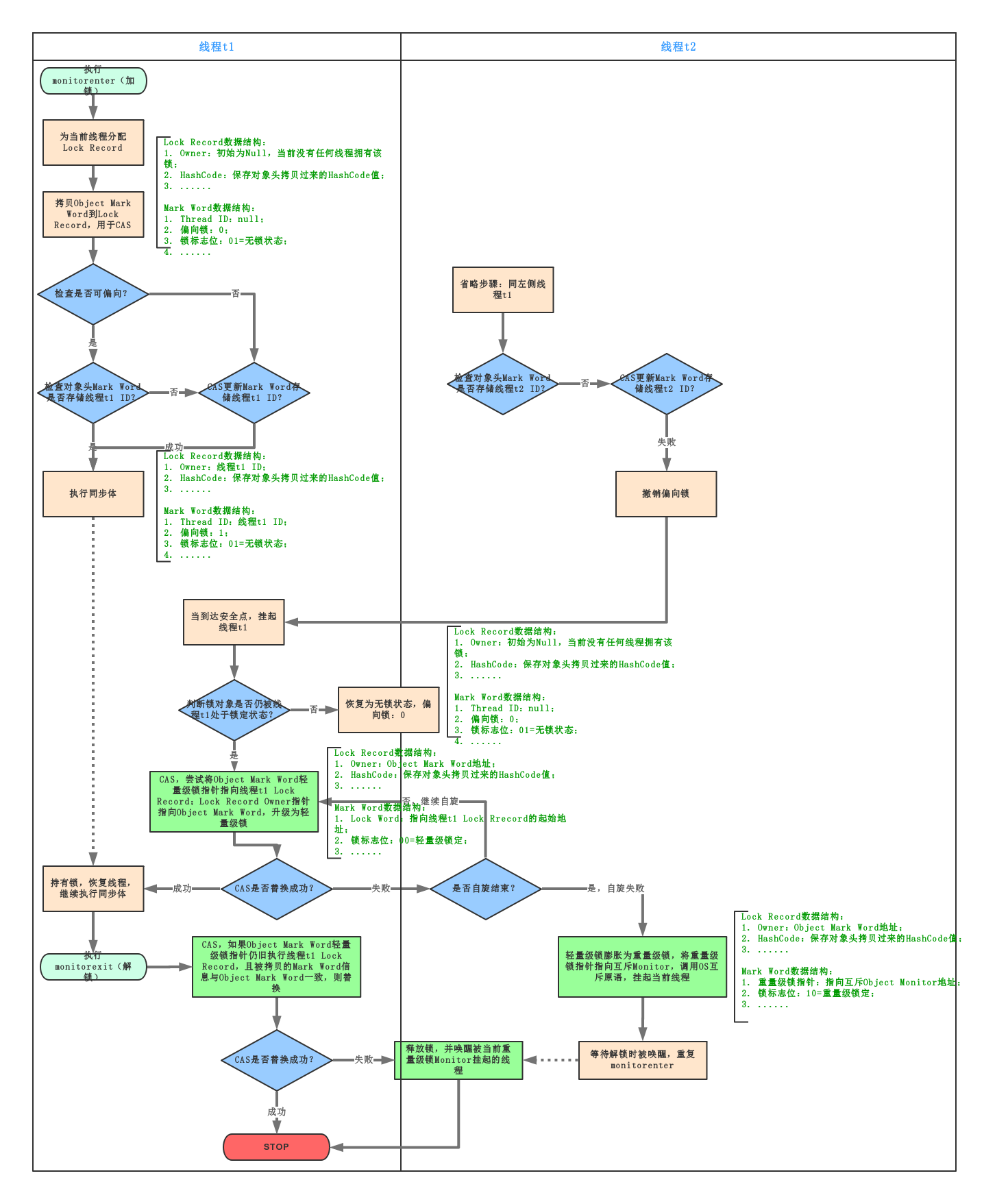 - MonitorExit指令:插入在方法结束处和异常处,JVM保证每个MonitorEnter必须有对应的MonitorExit;