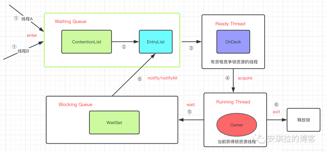 OnDeck 线程获取到锁资源后会变成 Owner 线程, 而没有获取到锁的线程仍然停留在 Entry List 中, 如果 Owner 线程被 Object#wait() 方法阻塞,则转移到 Wait Set 队列中, 直到某个时刻通过 Object#notify()/Object#notifyAll() 方法唤醒, 会重新进入到 Entry List 中 -