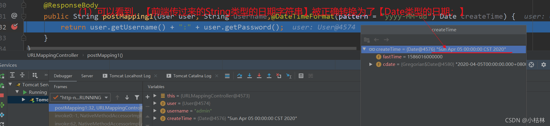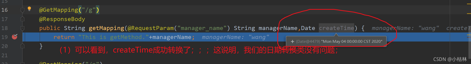 这儿我们用get方法测试一下,在方法参数中增加一个【Date类型的createTime】;