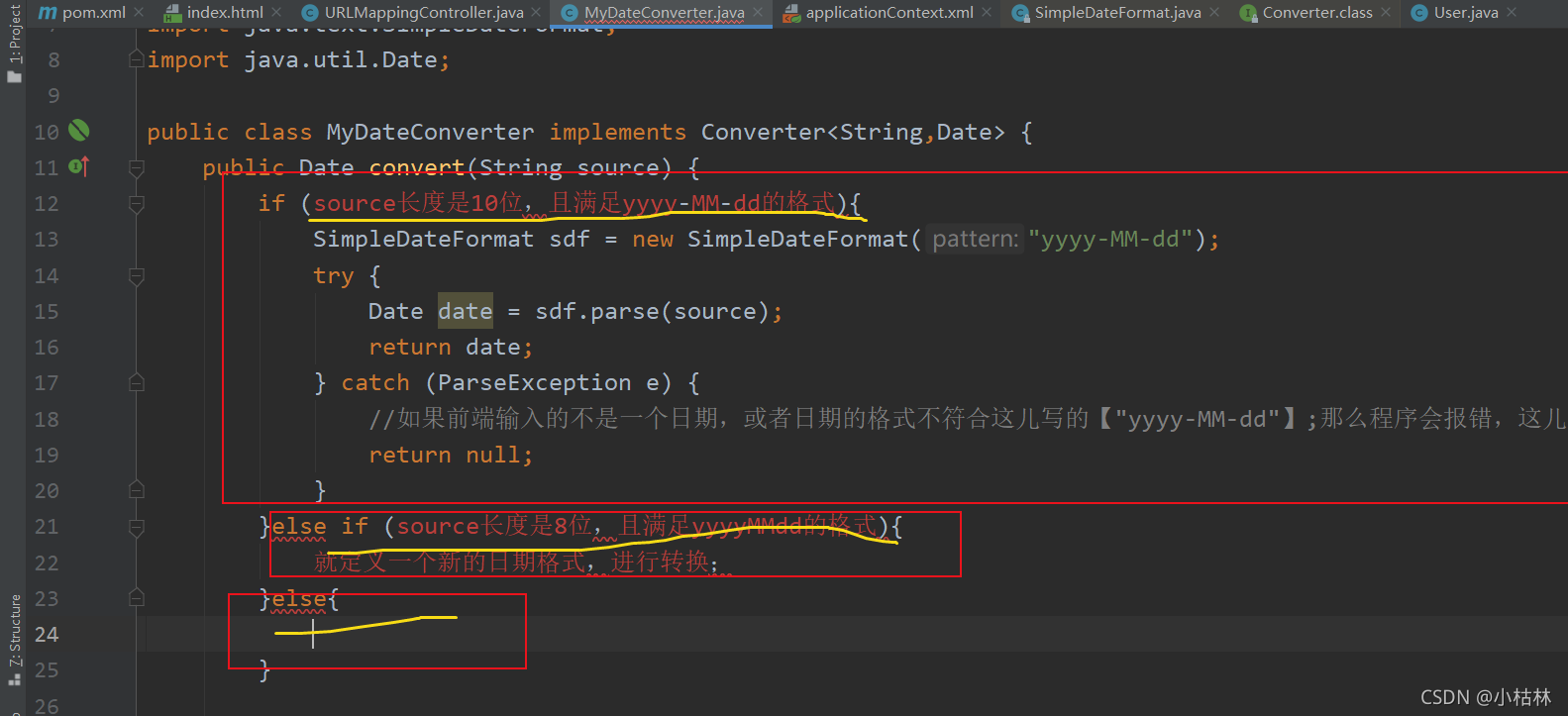 但是,保不齐,该大型系统中某些地方日期的输入格式是形如【20200504】的格式,那么为此,我们就需要修改下MyDateConverter日期转换器类了:根据实际的业务逻辑,在MyDateConverter类中,增加对不同情况的判断和分别处理就行了;