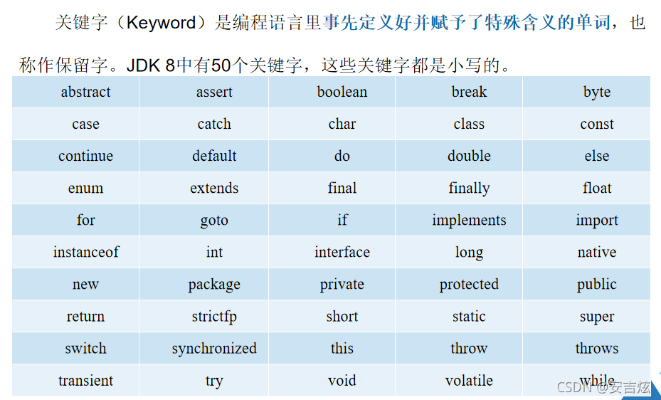 ?对变量,类以及方法等命名时不要与关键字重名,否则可能会导致关键字失效。