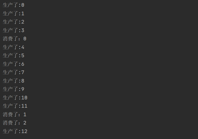 结果如下:可以看到,生产者线程先生产元素,(阻塞队列容量为10),当队列满时,队列阻塞,消费者线程消费元素,因为消费的慢,所以接下来生产者线程由于阻塞队列不能快速生产,只能等待消费者线程消费队列中的元素,生产者线程才能随着生产,这就是阻塞队列的缓冲作用。