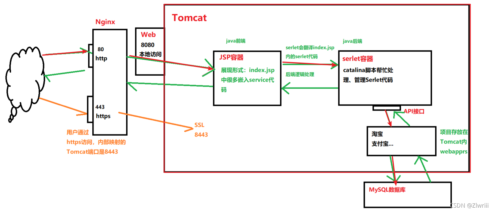 Servlet 容器:Servlet 翻译index.jsp中这些java代码,执行一些servlet任务操作,比如数据库交互、加密、支付宝、人脸识别;处理完后,将这些数据返回给JSP ,通过jsp中的index.jsp 展示出来(JAVA)