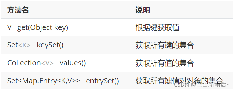 ????????需要注意的是,Map集合的元素的添加并不是Collection集合的add()方法,而是Put()方法。因为Map集合是键值对集合,那么我们如何获取集合中的每一个元素呢?这里集合也给我们提供了他的元素获取方法: