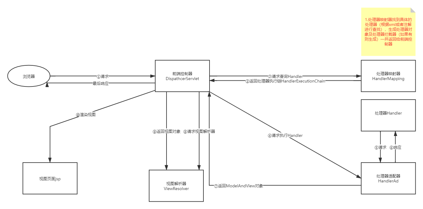 3. 处理器映射器找到具体的处理器(可以根据xml配置、注解进行查找),生成处理器对象及处理器拦截器(如果有则生成)一并返回给DispatcherServlet。