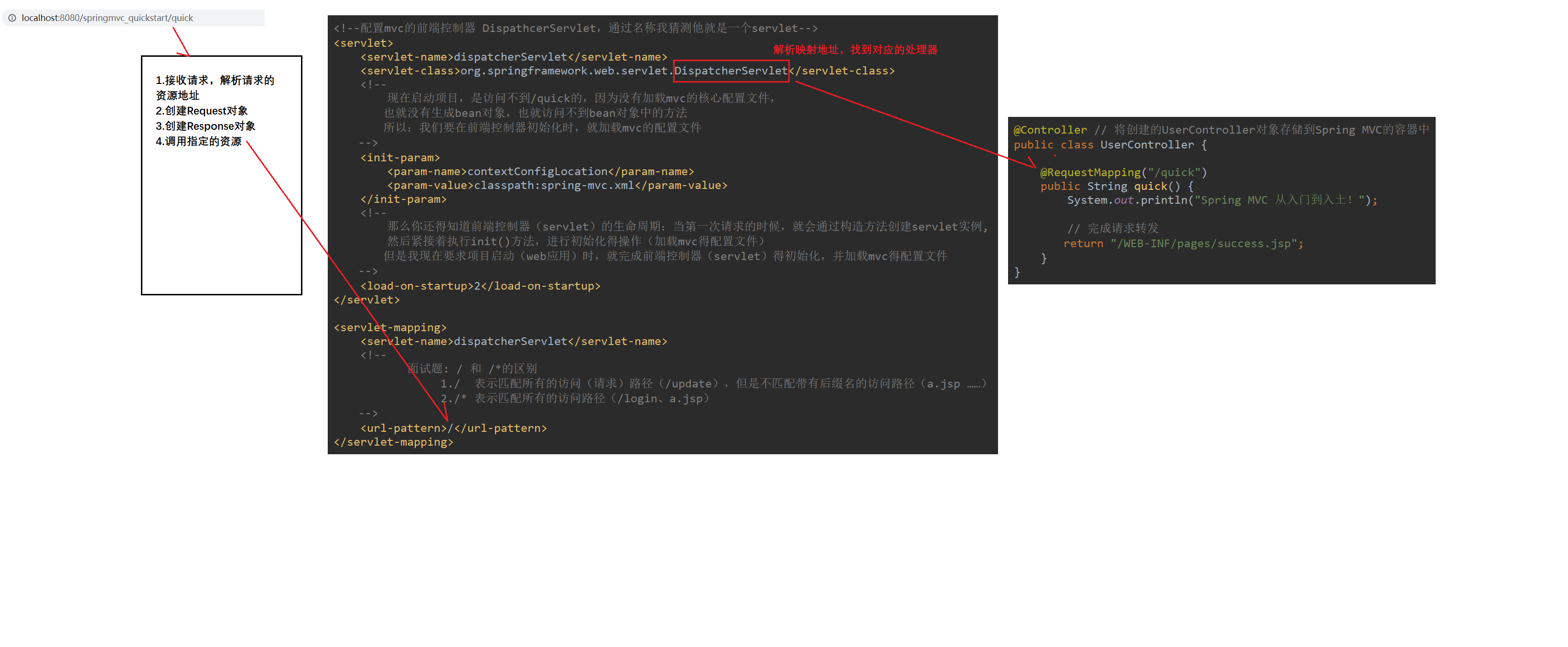 1. 用户发送请求至前端控制器DispatcherServlet。