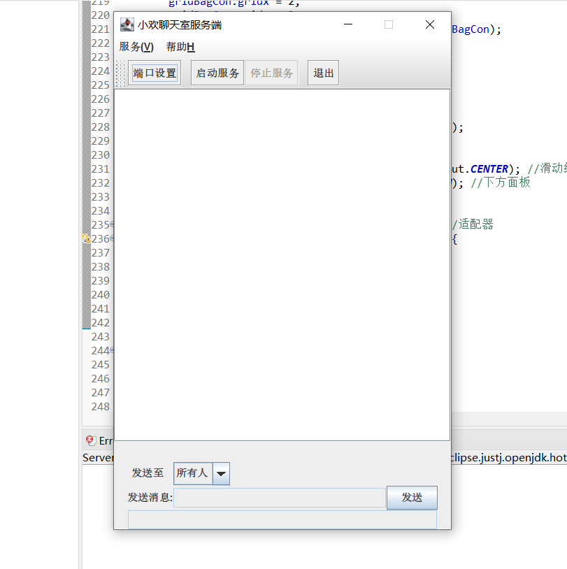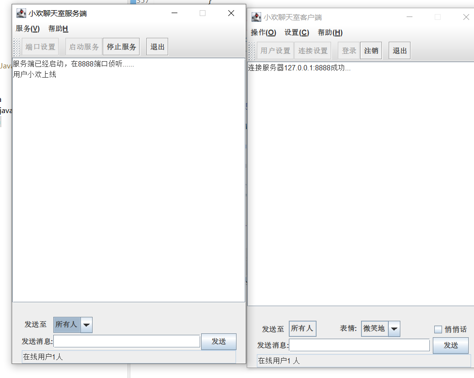 Client是客户代码包,只要在电脑上运行这里的代码,就可以出现客户端界面,约定好ip和端口号就可以通信了。这里就真正实现了客户端型软件,只是软件功能简单,可以使用web编程实现另外一种架构 可以来看一下界面  再来看一下客户端和服务端的交流
