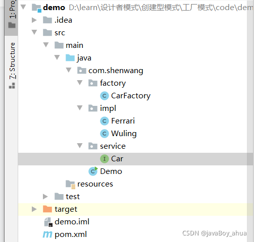 然后咱们再去编写咱们的工厂,CarFactory 主要用来为咱们创建车子