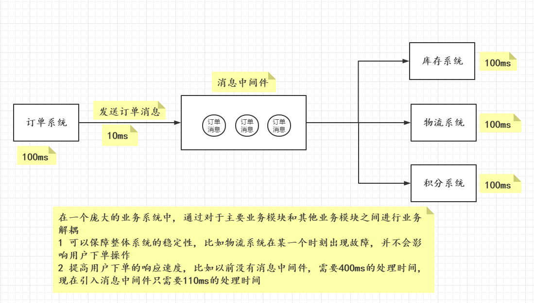 异步方式调用服务:系统的耦合性降低,就算某个服务挂掉,也不会影响其他主要业务;等挂掉的服务恢复正常,系统可以继续调用