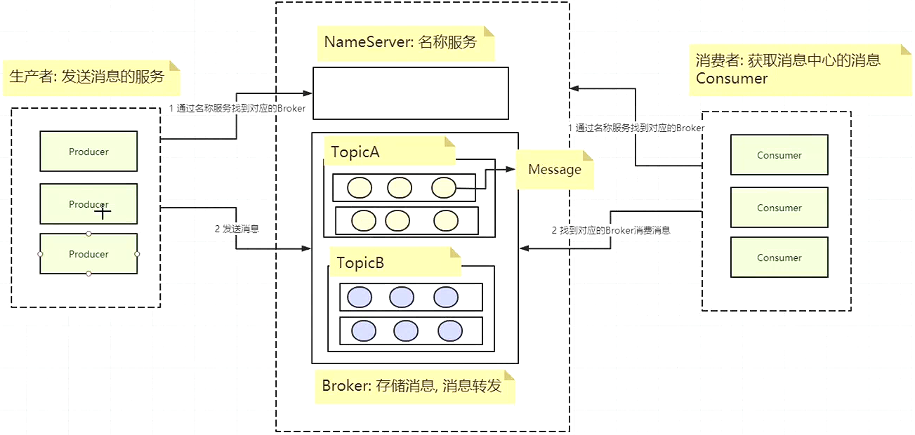 是数据处理服务器,不同的消息存储在不同的 Topic 中;同一个 Topic,为了提高消息处理的并发能力,会有多个 Queue 队列 - 启动生产者,连接 NameServer,获取对应的 Topic 信息,开始创建消息并发送