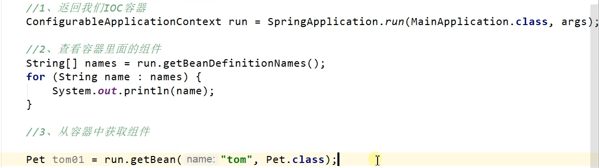 @Responsebody:返回字符串而非页面跳转 @Restcontroller = Responsebody+@Controller 自动扫描主程序所在包结果下的全部,不用显示配置scan springboot一个相当于下面三个  @config+bean等同于xml配置bean,注意@bean是在方法上组件名默认是方法名 获取组件  引入xml