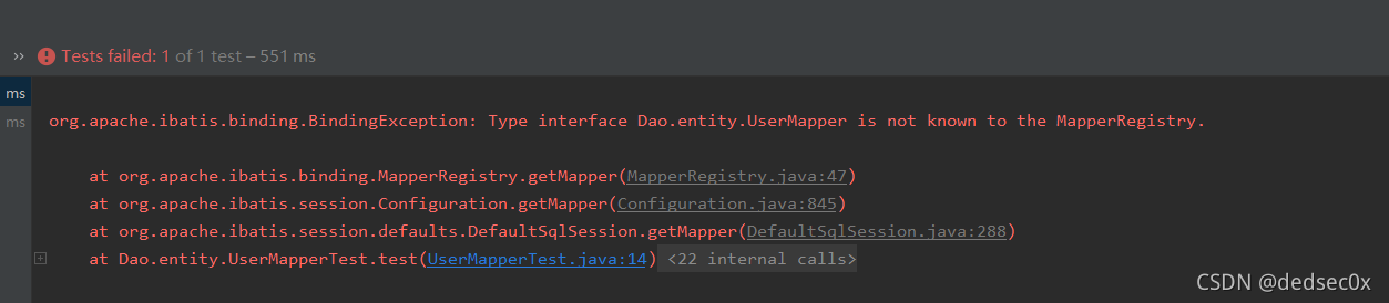报错原因是因为在mybatis-config.xml中没有注册我们后来编写的Mapper文件,解决此错误的方法就是在config.xml文件中添加我们的Mapper。