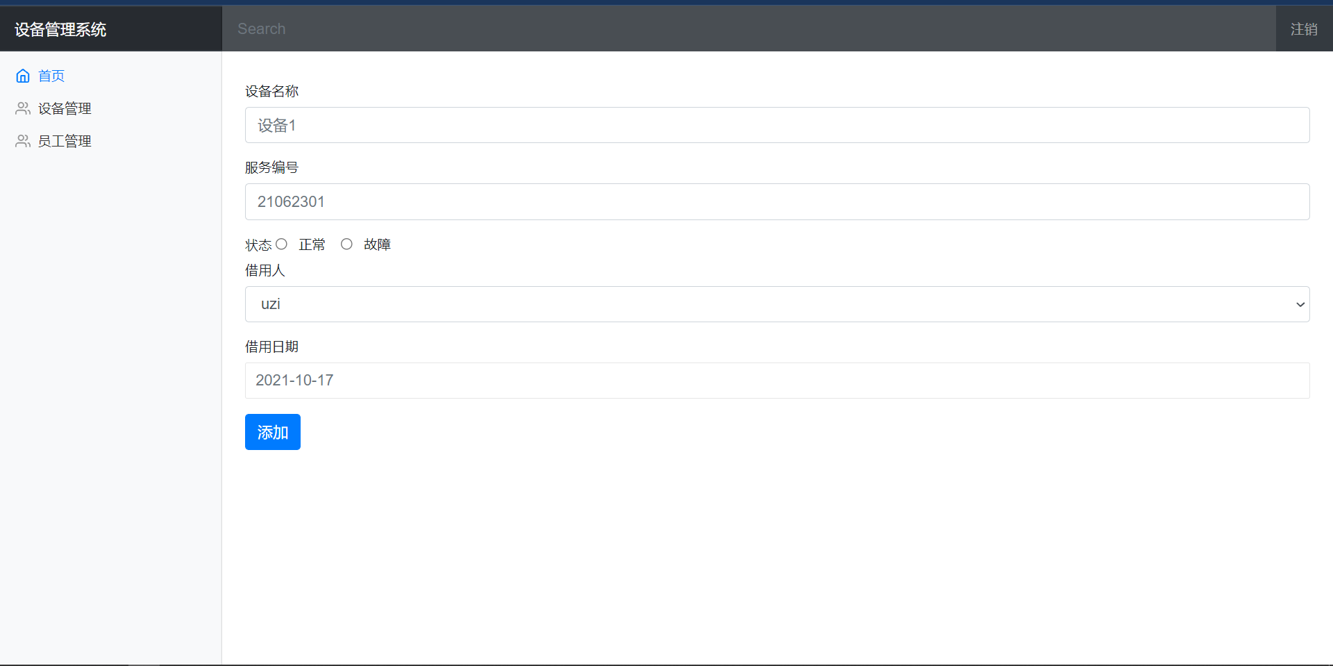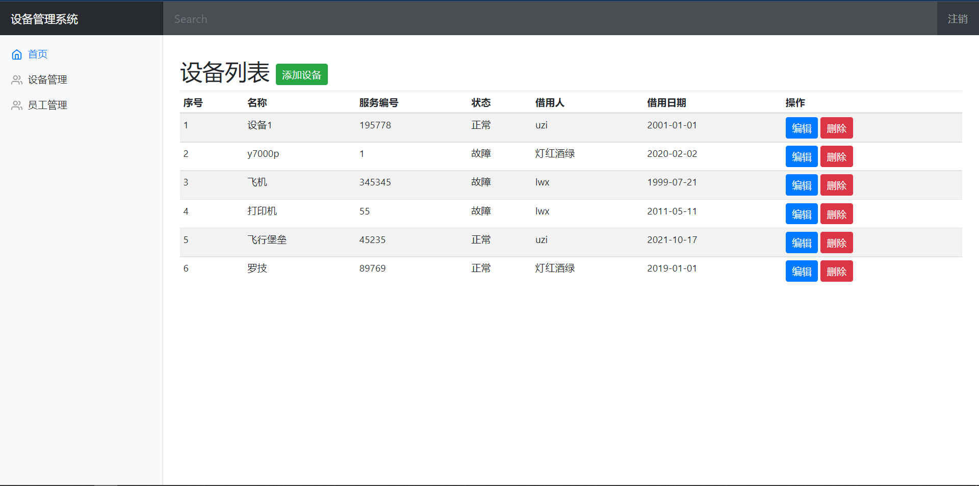 2、设备管理系统首页:  3、实现简单的增删改查的功能: 4、对借设备的人的处理: