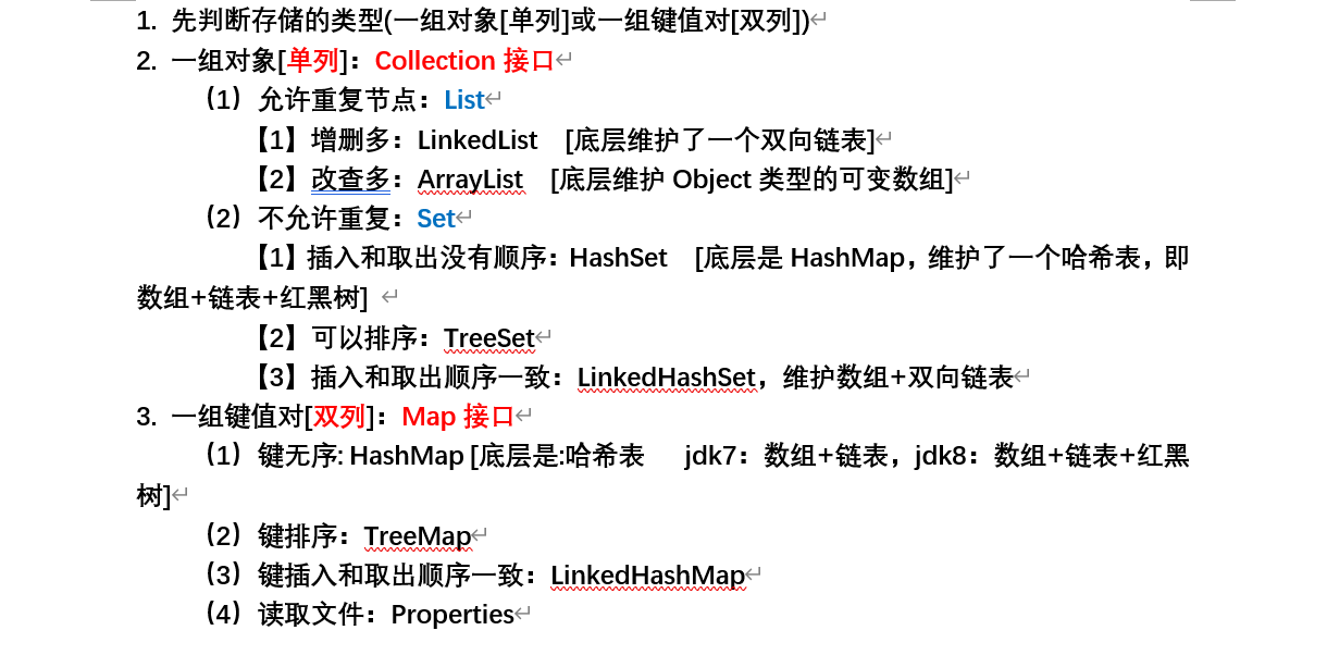 (1)允许重复节点:List 【1】增删多:LinkedList [底层维护了一个双向链表] 【2】改查多:ArrayList [底层维护Object类型的可变数组] (2)不允许重复:Set 【1】插入和取出没有顺序:HashSet [底层是HashMap,维护了一个哈希表,即数组+链表+红黑树] 【2】可以排序:TreeSet 【3】插入和取出顺序一致:LinkedHashSet,维护数组+双向链表
