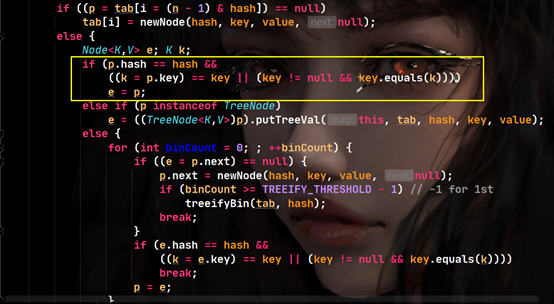 重点分析: 【1】如果算出的索引位置处,节点为空,则直接添加新节点。此时P指向table表的该索引元素所在处。  【2】否则不为空的话,开始比较 (1)比较哈希值是否相等 (2)比较加入元素的值是否相等,此时着重看equals方法。即,可以直接比较字符串内容,也可以直接比较对象,就看是否重写了equals方法。若相等,则节点插入失败。  【3】若在【2】比较后,与table表中该索引处元素不想等,则在链表中依次往后找,找到最后位置插入进去新节点,立马结束循环;  【4】若在【3】中,依次往后链表找的过程中,发现有节点与之相等,则立马结束循环,节点插入失败。