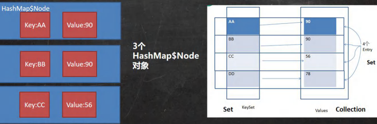 (1)Map接口中有Entry<K,V>接口。 Entry接口中有常用方法: 【1】K getKey();【2】V getValue();【3】V setValue(V value); 【4】int hashCode();【5】boolean equals(Object o);; (2)HashMap类中有内部类Node<K,V>,该类实现了Entry<K,V>接口,且该类里面有属性:int hash;K key;V value;Node<K,V> next;即k-v最后是存在于Node<K,V>类的对象中。 (3)k-v为了方便程序员的遍历,还会创建EntrySet集合,该集合存放的元素的类型 Entry,而一个Entry对象里面就有k ,v 。EntrySet<Entry<K , V>>即: transient Set<Map.Entry<K, V>> entrySet; (3)entrySet 中,定义的类型是Map.Entry ,但是实际上存放的还是 HashMap$Node这时因为 static class Node<K, V> implements Map.Entry<K, V> (4)当把HashHap $ Node对象存放到entrySet就方便我们的遍历,因为 Map.Entrfy提供了重要方法K getKey( ); v getValue( ); 【Map存放数据的key-value示意图】