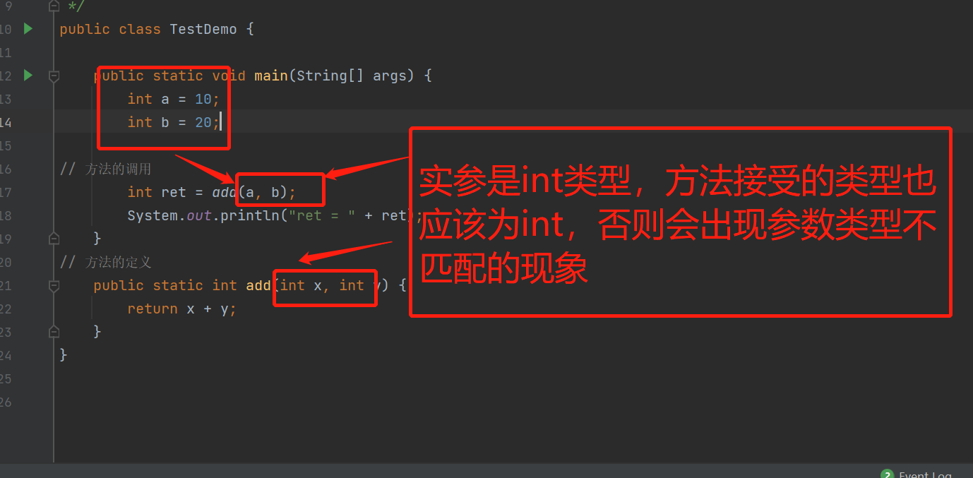 - 在调用方法时,实参和形参在数量上、类型上、顺序上应严格保证一一对应的关系,否则就会出现参数类型不匹配的错误,从而导致调用方法失败。如下: