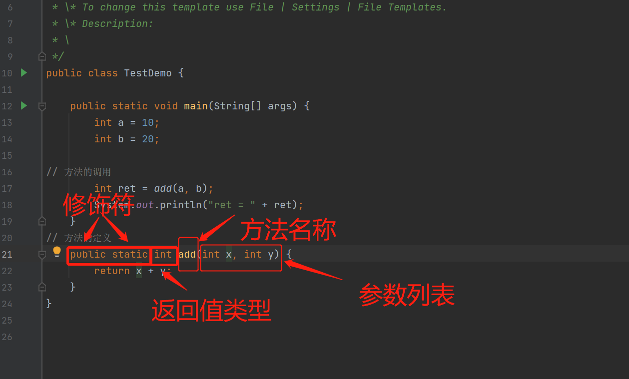 //方法定义 public static 方法返回值 方法名称([参数类型 形参 …]){ 方法体代码; [return 返回值]; } // 方法调用 返回值变量 = 方法名称(实参…);