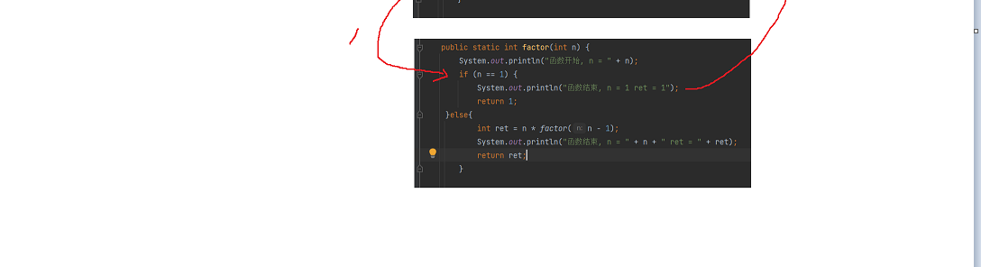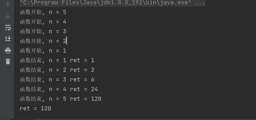 System.out.println("函数结束, n = " + n + " ret = " + ret);