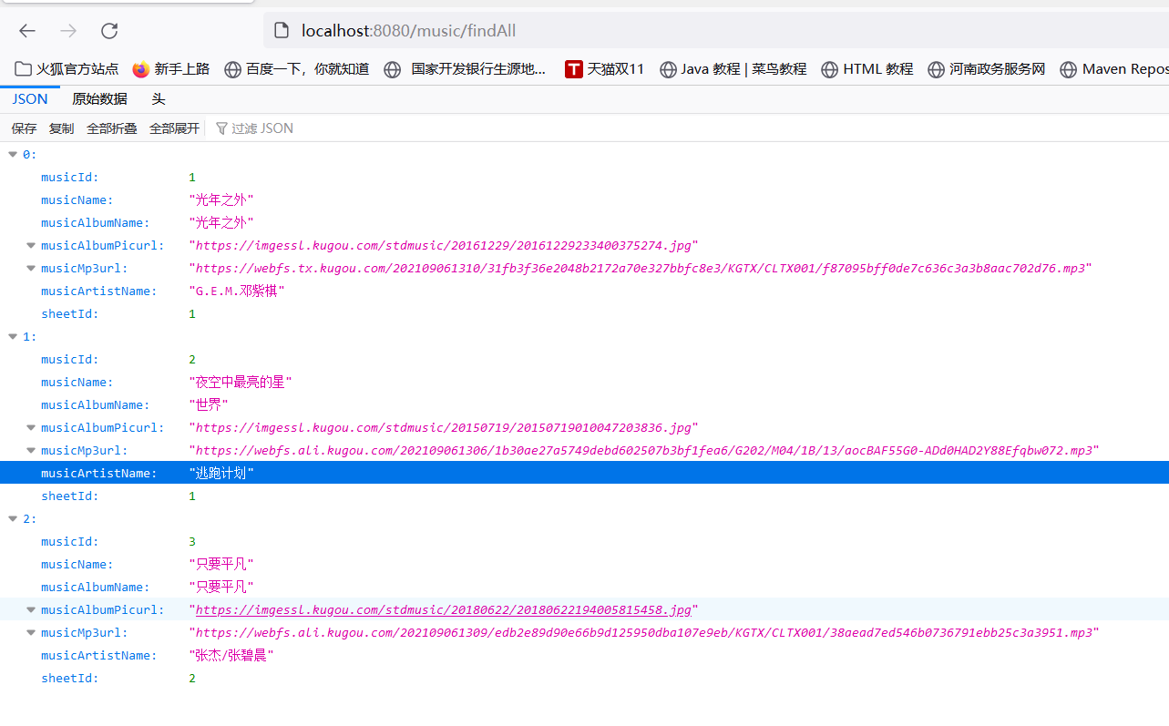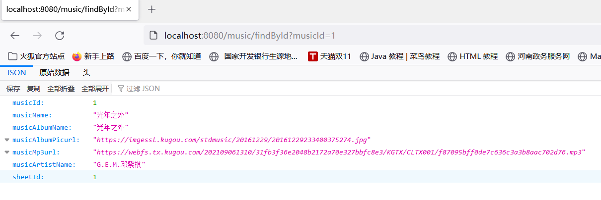 ?输入对应的网址:http://localhost:8080/music/findById?musicId=1