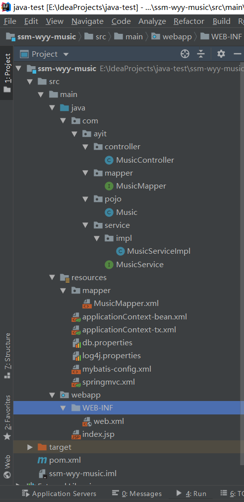 5.创建db.properties、log4j.properties、springmvc.xml、mybatis.xml、applicationContext-bean.xml、applicationContext-tx.xml、MusicMapper.xml配置文件