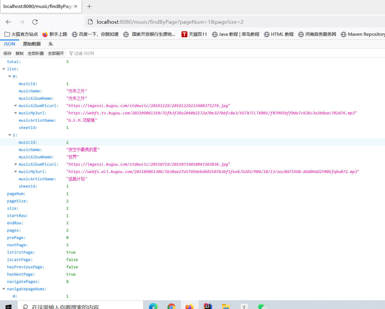 ?输入对应网址:http://localhost:8080/music/findByPage?pageNum=1&pageSize=2