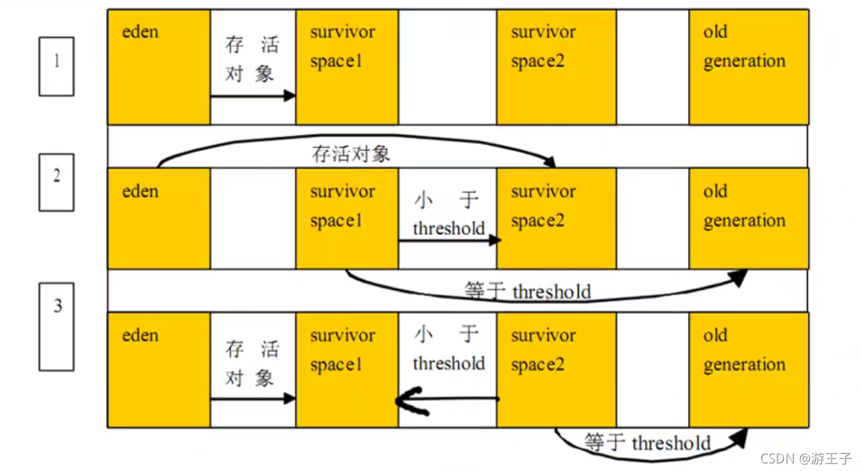 - 由Eden区、 survivor spaceo (From Space)区向survivor space1 (To Space)区复制时,对象大小大于To Space可用内存,则把该对象转存到老年代,且老年代的可用内存小于该对象大小